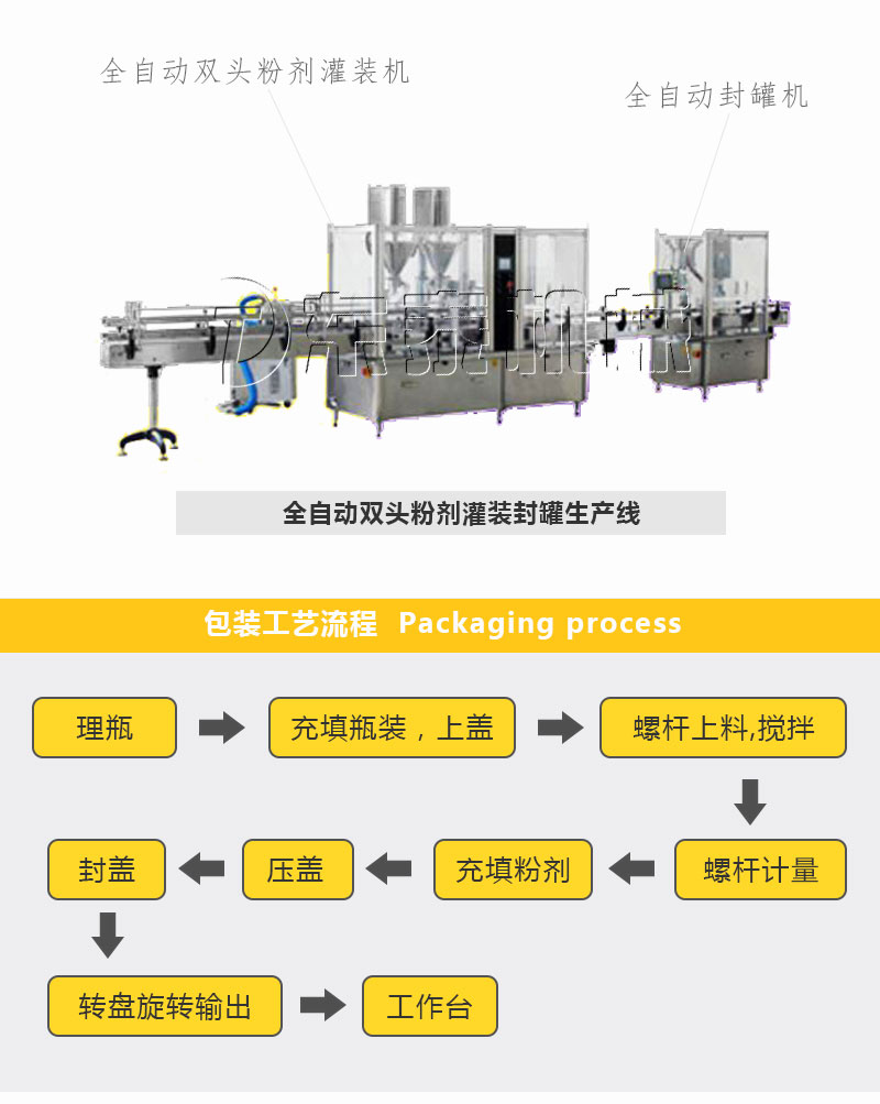 全自動粉劑灌裝機是我公司的主打產(chǎn)品,根據(jù)客戶的要求公司開發(fā)出了單頭、雙頭、四頭、六頭瓶裝生產(chǎn)線,全自動奶粉灌裝機專門針對藥品、保健品、食品行業(yè)的粉劑瓶裝。結(jié)合不同的客戶需求可配套:上料(螺桿、真空)、自動理瓶,單(雙)頭加塞、旋蓋、軋蓋、壓蓋等,鋁箔封口(風冷、水冷),金檢,鋁箔塞墊,貼標,碼瓶熱收縮,裝盒,三維包裝(帶金線),裝箱等。