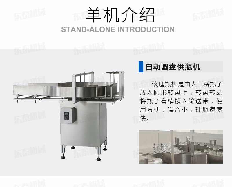 該理瓶機(jī)是由人工將瓶子放入圓形轉(zhuǎn)盤上,轉(zhuǎn)盤轉(zhuǎn)動將瓶子有續(xù)撥入輸送帶,進(jìn)入灌裝機(jī)進(jìn)行灌裝。使用方便,噪音小,理瓶速度快,操作簡單是不可缺少的一個(gè)環(huán)節(jié)。