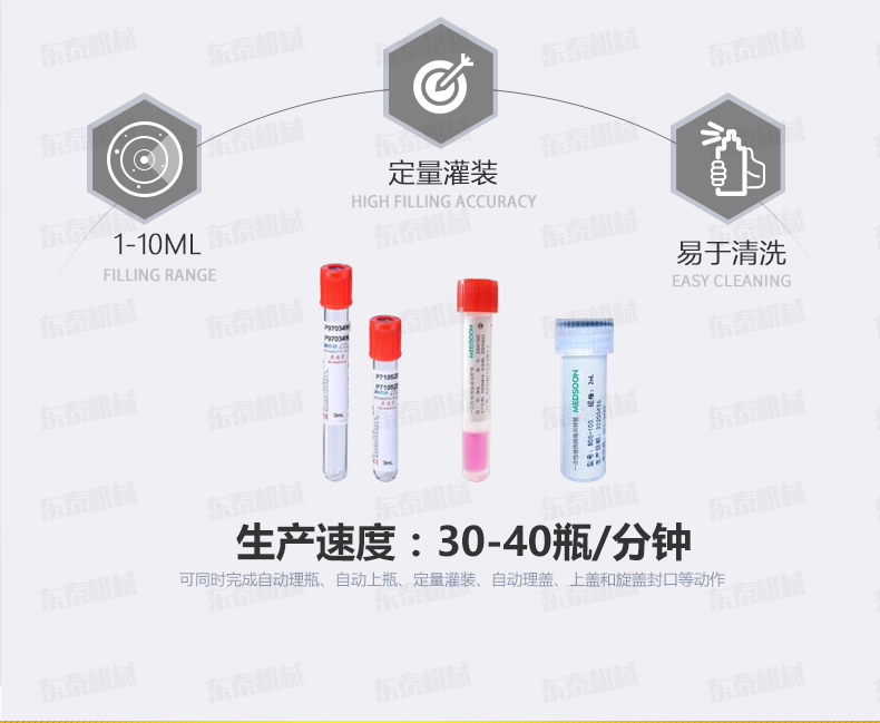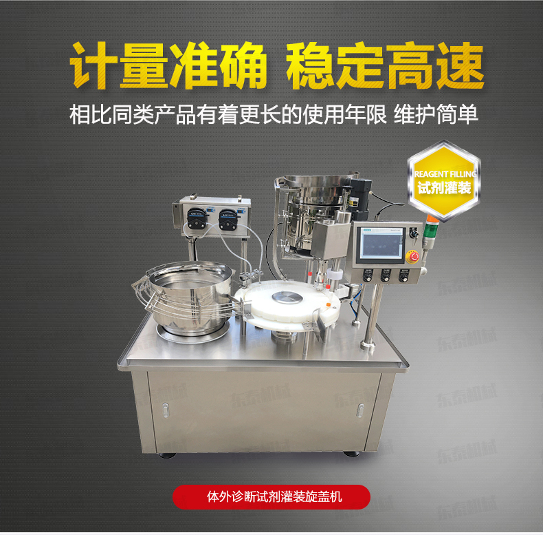 本機是在引進(jìn)和吸收國外技術(shù)的基礎(chǔ)上,由我公司自主研發(fā)的一款I(lǐng)VD診斷試劑灌裝旋蓋一體機,能同時完成自動理瓶、自動上瓶、定量灌裝、自動理蓋、上蓋和旋蓋封口等動作。本機采用日本高精度封閉式凸輪分度工位器,精度高,運行可靠,使用壽命長。該分度器結(jié)構(gòu)簡單,長期使用無需維修。該型號設(shè)備主要用于ⅣD體外診斷試劑制藥、生物制藥行業(yè)及科研領(lǐng)域裝。機器設(shè)計緊湊合理、外形簡潔美觀,灌裝量調(diào)節(jié)方便。