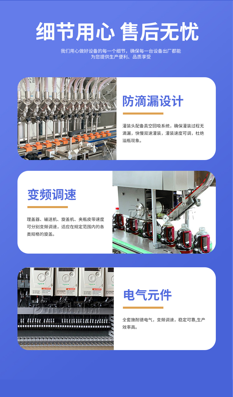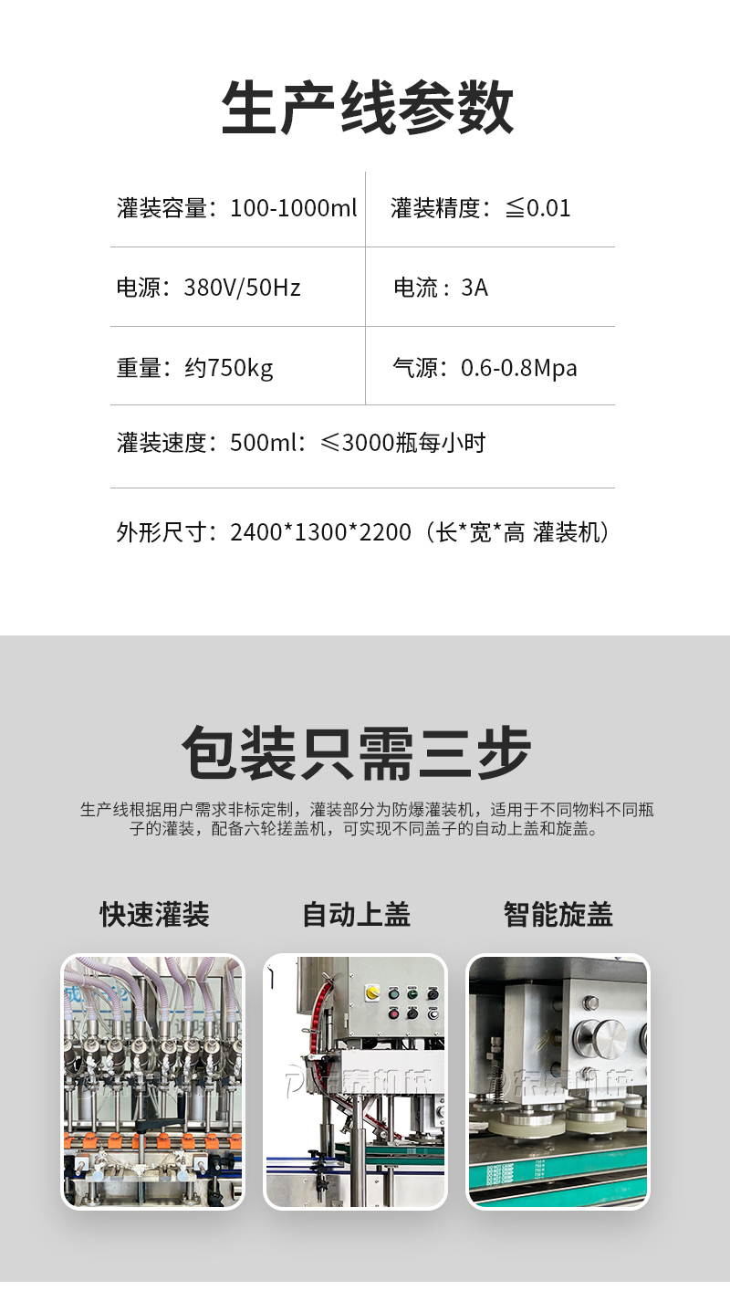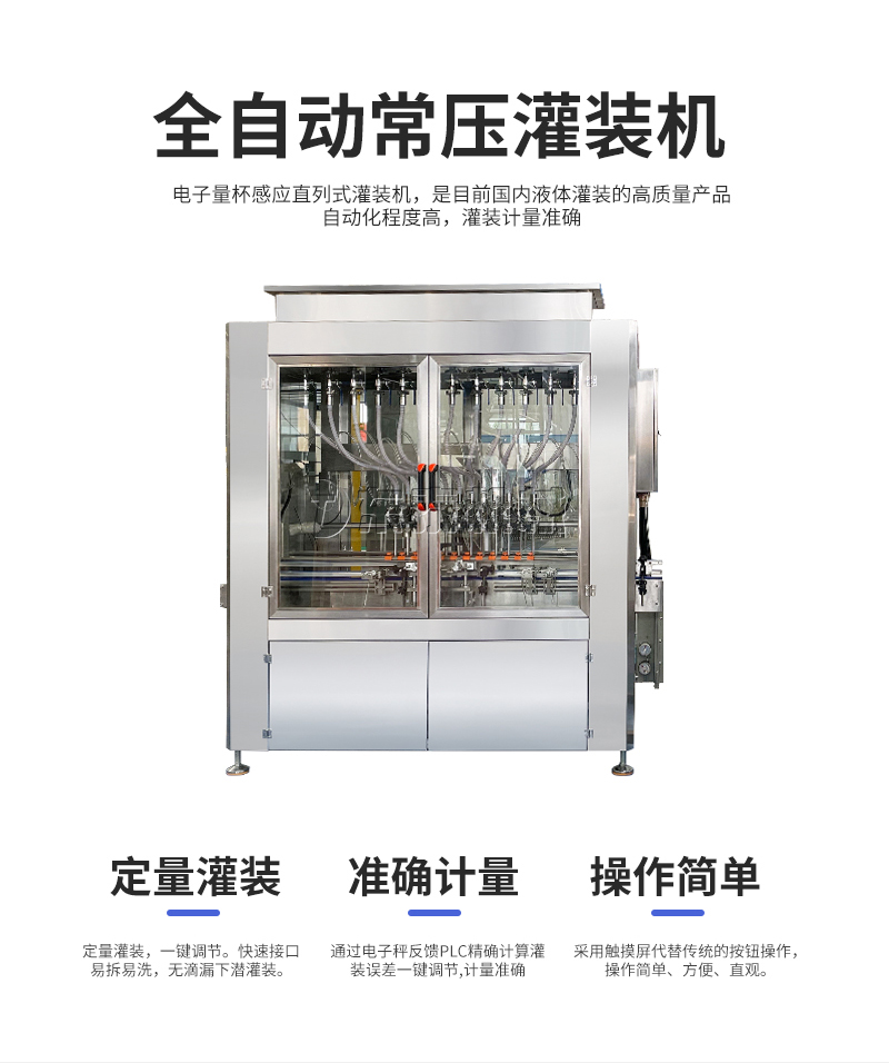 電子量杯感應(yīng)直列式灌裝機(jī),是目前國(guó)內(nèi)液體灌裝的高端產(chǎn)品,自動(dòng)化程度高,灌裝計(jì)量精確,適用于塑料瓶、玻璃瓶等各種幾何形狀的瓶型的不含氣體的酒水、飲料、調(diào)味品及其他溶液的定量灌裝。機(jī)器采用觸摸屏代替?zhèn)鹘y(tǒng)的按鈕操作,操作簡(jiǎn)單、方便、直觀?萍己扛。機(jī)器灌裝計(jì)量可通過(guò)觸摸屏對(duì)灌裝時(shí)間的調(diào)整實(shí)現(xiàn)不同計(jì)量灌裝,方便操作者使用。