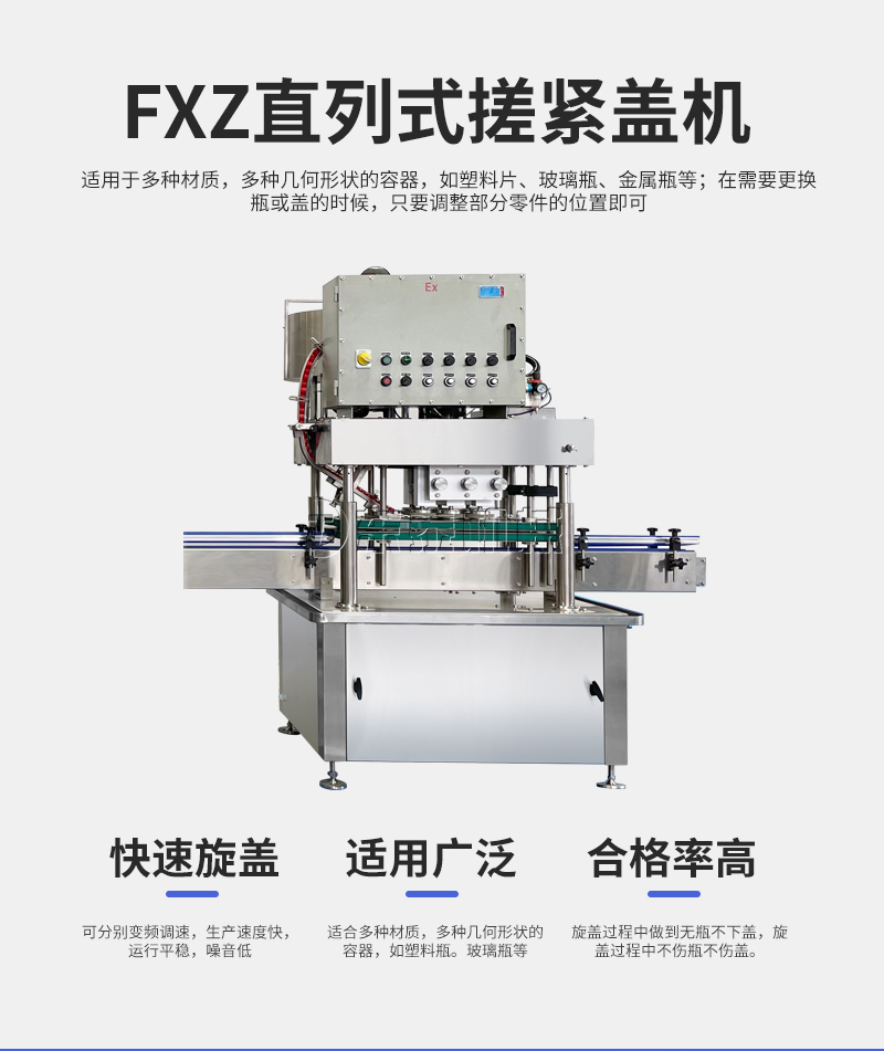 本機(jī)適用于多種材質(zhì),多種幾何形狀的容器,如塑料片、玻璃瓶、金屬瓶等;在需要更換瓶或蓋的時(shí)候,只要調(diào)整部分零件的位置即可,無(wú)需更換任何配件;在旋蓋過(guò)程中可以做到無(wú)瓶不下蓋。理蓋器、輸送機(jī)、旋蓋機(jī)、夾瓶皮帶速度可分別變頻調(diào)速,適應(yīng)在規(guī)定范圍內(nèi)的各類規(guī)格的旋蓋。(附:特殊規(guī)格定制即可)