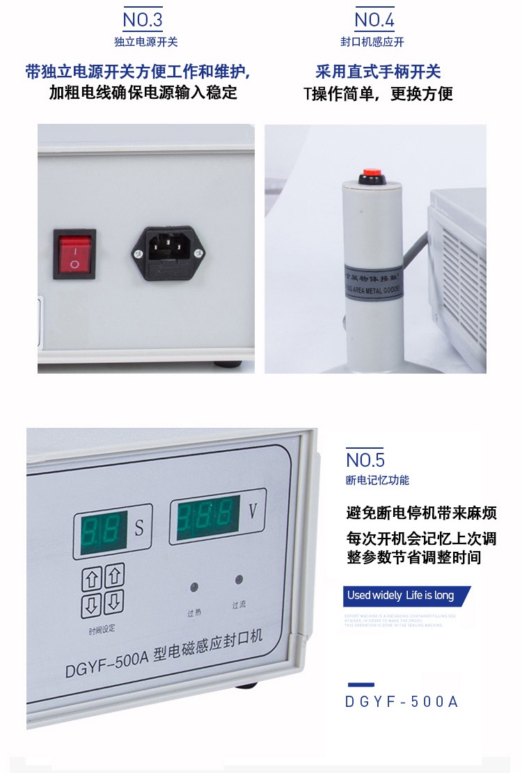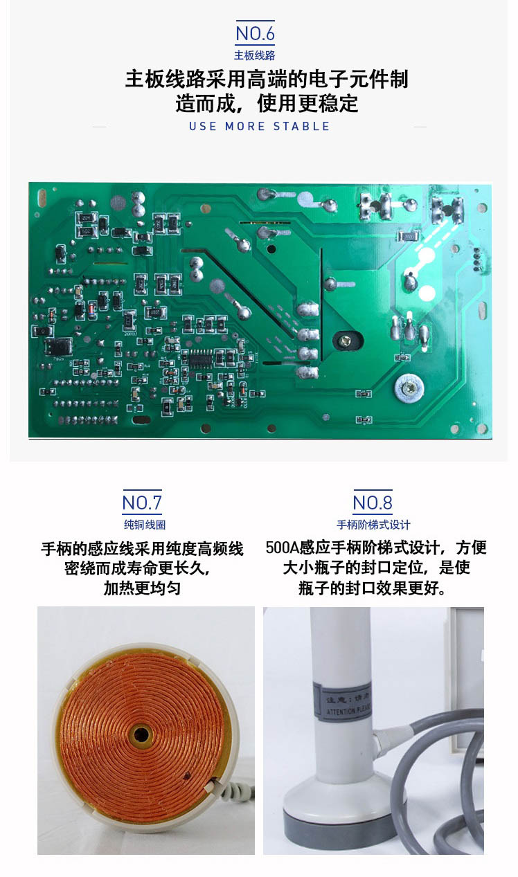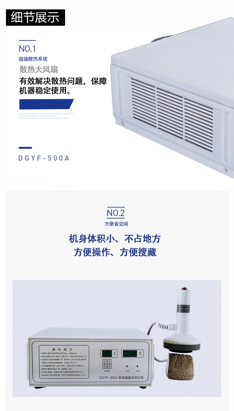 該封口機(jī)是一種便攜式電磁感應(yīng)加熱封口設(shè)備,專為制藥、化工、農(nóng)藥、食品、化妝品、輕工行業(yè)對容器進(jìn)行鋁箔嚴(yán)密封口。封口材質(zhì)使用廣泛,可以是聚乙烯、聚丙烯、聚苯乙烯、聚酯以及玻璃瓶,但不能用于金屬瓶體及瓶蓋。本機(jī)小巧輕便,使用簡單,適用于小批量生產(chǎn)和實(shí)驗(yàn)室作業(yè)。本機(jī)采用國外先進(jìn)線路,選用日本最新模塊化功率器件,較于一般電子感應(yīng)加熱器更省電,熱效率達(dá)到90%以上,瞬時加熱速度為后者的20-30倍,因此不僅適用于熱封性能較好的聚乙烯、聚丙烯材質(zhì)的瓶體,而且對熱封性能較差的聚酯瓶、玻璃瓶也有極好的封口效果。