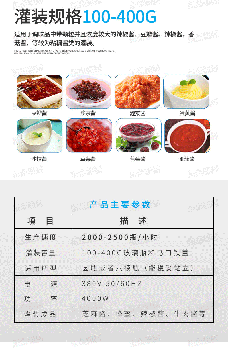 為了能夠更好的服務社會我們東泰辣椒醬灌裝機踏上了多樣化生產道路,并且現(xiàn)在已經有了一定的顯著成績,原來的傳統(tǒng)設備由于功能有所局限,只能灌裝普通的醬料,而經過我們改進后的全自動辣椒醬灌裝機能夠實現(xiàn)對市場上絕大多數(shù)的醬料的灌裝,尤其是那些含顆粒的顆粒漿狀流體、半流體、膏體、漿狀類的物料灌裝,如辣椒醬、牛肉醬、牛肉大醬、豆瓣醬、芝麻醬、果醬、火鍋底料的等物料的灌裝,在市場中,辣椒醬灌裝機有眾多的機會來展現(xiàn)出自我的風采,不僅是因為再市場中的廣泛應用,還有這十分出眾的全自動化的一鍵式的完成一系列的工作流程,更能夠凸顯出市場對于它自身的需求。